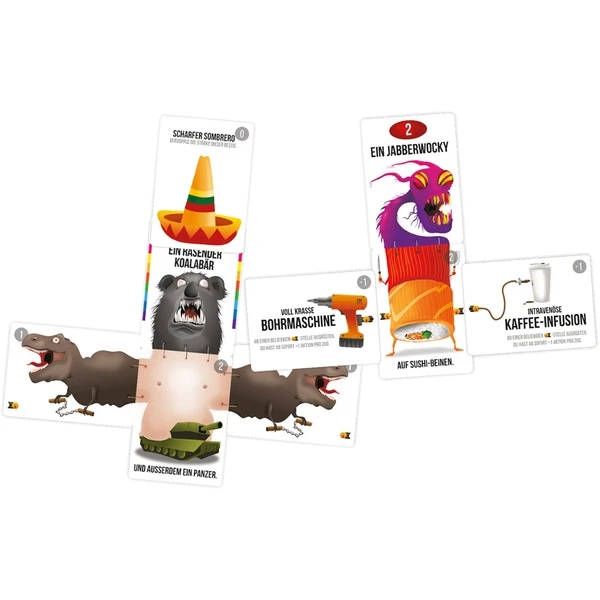 Bears vs. Babies ist ein Kartenspiel von den Machern von Exploding Kittens, bei dem man monströse Bären zusammenstellt (wie die Schachtel schon zeigt), um schreckliche Babys zu fressen. Die Monster verstärkt man beispielsweise mit einem Nunchuck schwingenden T-Rex, intravenösen Kaffee-Infusionen oder einem scharfen Sombrero. Zusätzlich heben wilde Provokationen, Zerstückelungen, verstecken Identitäten und sanft gesungene Schlaflieder das Spiel auf das nächste Level. Obwohl alle gegen die Armeen von Babys kämpfen, findet der wahre Kampf zwischen den Spielern statt. In Bears vs. Babies dreht sich alles darum, wundervolle Monster zu bauen, leckere Babies zu fressen und die Gegenspieler zu vernichten.Art.-Nr.: 1498515