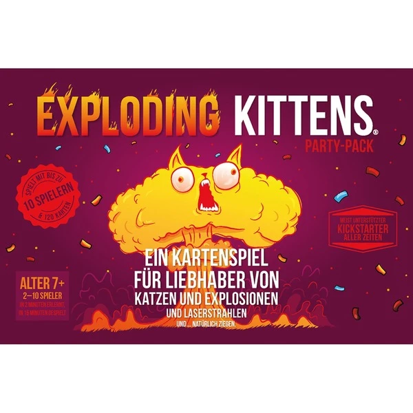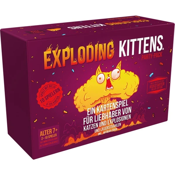 Ihr liebt Katzen mit spanischem Flair? Dann öffnet die ultimative Party-Box der Exploding Kittens und crasht ihre Party. Die Kittens veranstalten eine Riesen Sause! ARRRIIBBBAA! Der erfolgreiche Kickstarter jetzt als Party Pack! Für jeden Exploding Kittens-Fan ein Must-have. Exploding Kittens Party Pack ist eine spezielle Box, die jedes Mal Party-Musik spielt und miaut, wenn sie geöffnet wird. ARRRRRIBBBAA! Wer Exploding Kittens kennt und ein Fan ist, der weiß wie es funktioniert. Doch hier nochmal für euch. Die Spieler ziehen reihum Karten, bis einer ein Exploding Kitten zieht. Derjenige explodiert sofort, stirbt und scheidet aus – es sei denn, er hat eine Karte zur Entschärfung. Mit ihr kann er das Kätzchen beruhigen und vom Explodieren abhalten, zum Beispiel mithilfe eines Laserpointers, Katzenminze oder durch Bauchkraulen. Alle anderen Karten dienen nur einem Zweck: zu verhindern, dass man ein Exploding Kitten zieht.Art.-Nr.: 1727259