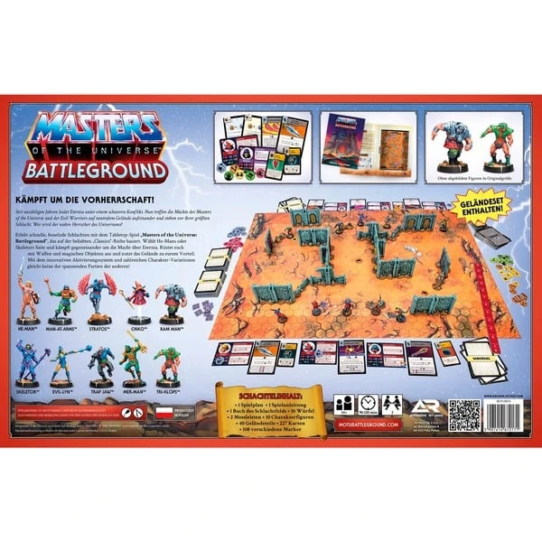 Masters of the Universe: Battleground ist ein Fantasy-Spiel für zwei Spieler, das den Krieg zwischen den beiden gewaltigen Mächten von Eternia, den Masters of the Universe und den Evil Warriors abbildet. Während des Spiels steuert jeder Spieler Charaktere von einer der beiden Mächte und rüstet sie mit einer Vielzahl von Waffen und Gegenständen aus. Dann versucht jeder Spieler, seine Ziele zu erreichen, Nebenmissionen zu erfüllen und schließlich die gegnerische Macht zu besiegen. Mit vielen Charakter-Figuren, Ausrüstungskombinationen und einem innovativen Aktivierungssystem wird jede Partie einzigartig und spannend.Art.-Nr.: 1902338