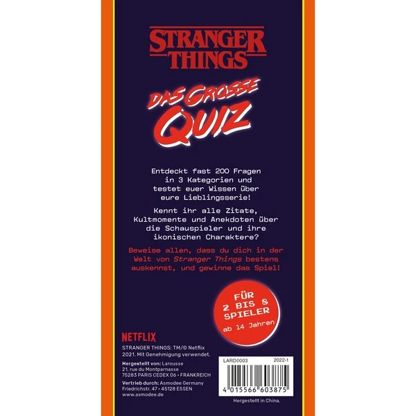 | Inhalt/Ausstattung | 57 Fragenkarten zur Serie, 65 Fragenkarten zu den Charakteren, 67 Fragenkarten zu Zitaten, 9 Personenkarten, 1 Demogorgon-Karte | ||