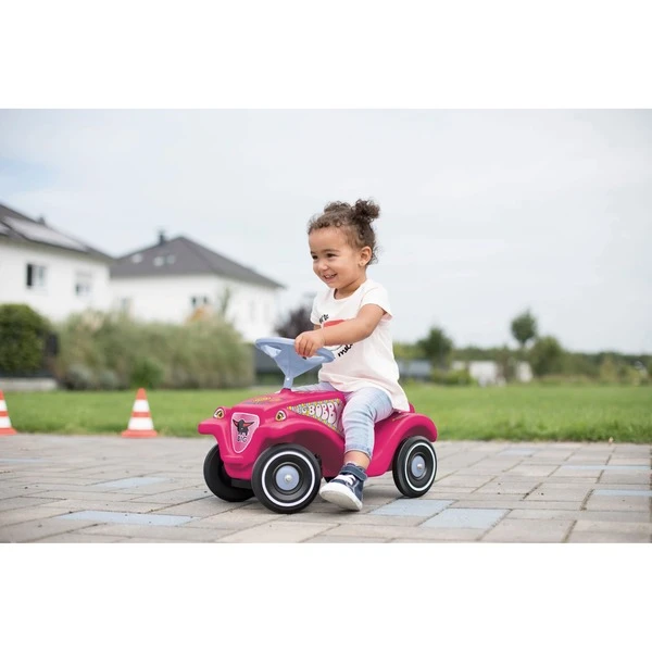 Fröhliches Himbeerpink und ein freches, witziges Süßigkeiten-Design in Trendfarben laden Kinder ab 12 Monaten zu Ausflügen draußen und drinnen ein. Doch nicht nur im Hinblick auf Design und Extras überzeugt das Fahrzeug aus der Bobby-Car-Linie. Das BIG-Bobby-Car Classic ist legendär in seiner Form und unschlagbar in Sachen Qualität. Die seit Jahrzehnten bewährte, unveränderte Karosserie des beliebten Kinderautos ist ergonomisch perfekt auf die Bedürfnisse der kleinen Fahrer und Fahrerinnen abgestimmt. Ein griffiges Sicherheitslenkrad mit mechanischer Hupe, vier robuste und abriebfeste Kunststoffräder, je eine Anhängerkupplung vorne und hinten sowie eine Kniemulde zum Fahren für größere Kinder ergänzen die spielstarke Ausstattung. Für einen kleinen Wendekreis sorgt die stufenlose Achsschenkellenkung des BIG-Bobby-Car. Die hervorragende Verarbeitungsqualität und der tiefliegende Schwerpunkt machen das BIG-Bobby-Car zum besonders sicheren Spielzeug.