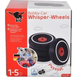 Kinder lieben das kernige Motorengeräusch, das die Räder des BIG-Bobby-Car bei heißen Spritztouren über den Asphalt erzeugen. Viele Eltern hätten es gelegentlich gerne etwas leiser. Für sie bietet BIG zum Nachrüsten für das BIG-Bobby-Car-Classic den Rädersatz BIG-Whisper-Wheels an. Durch die spezielle Gummimischung rollt der rote Flitzer damit deutlich leiser durch Gärten und Kinderzimmer. Der Rädersatz lässt sich mit dem enthaltenen Montagewerkzeug an allen BIG-Bobby-Car-Classic befestigen. Hierzu müssen die Hutclips der montierten Räder entfernt werden. Im Paket sind Befestigungsclips sowie eine leicht verständliche Montageanleitung enthalten.Art.-Nr.: 1195271