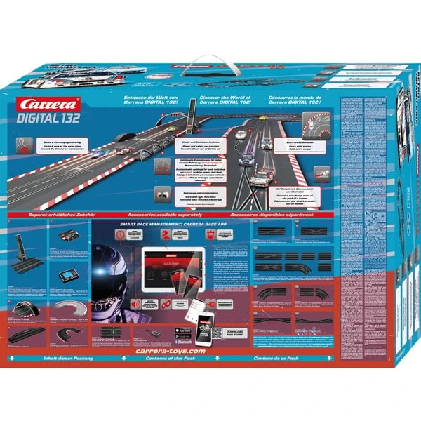 | Inhalt/Ausstattung | 2 Handregler, 4 Standardgeraden, 3 Kurven (60°), Control Unit, Doppelweiche, 4 Endstücke für Kurvenaußenrand, 20x Fahrbahnverriegelung, 10 Doppelschleifer, DIGITAL 132 Transformer, Spurwechselkurve links, außen nach innen, 3 Fahrzeuge | ||