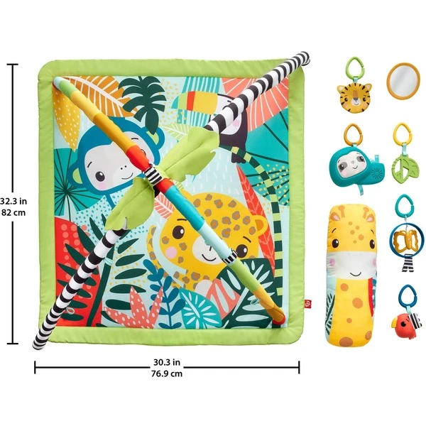 Die Fisher-Price 3-in-1 Rainforest Spieldecke bietet Babys, Neugeborenen und sogar Kleinkindern wilde sensorische Erlebnisse. Neugeborene können sich auf die weiche Spielmatte legen, während über ihnen sechs Spielzeuge an den Bögen hängen. Für das Spielen in der Bauchlage kann der anpassbare Bogen nach unten gleiten, um das Spielzeug in Reichweite des Babys zu bringen, während das Giraffen-Spielkissen das Baby beim Spielen stützt. Außerdem bietet das Faultier mit bis zu 20 Minuten Musik und Lichtern spannenden Spielspaß beim Spielen in der Bauchlage über das Spielen im Sitzen bis hin zu Spielspaß unterwegs.Art.-Nr.: 1888524