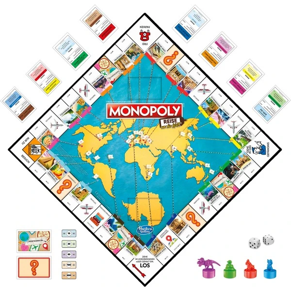 Monopoly Reise um die Welt ist eine spannende Version des klassischen Monopoly-Spiels. Hier werden statt Straßen Sehenswürdigkeiten gekauft und weitere Reiseziele entdeckt. Um zu gewinnen wird der abwischbare Spielplan mit Stempeln versehen. Mit den Reisetagebuchkarten können Erinnerungen festgehalten werden und in zukünftigen Partien den Spielverlauf beeinflussen, während die Besitzrechtkarten allerlei wissenswerte Infos über die Sehenswürdigkeiten enthalten. Diese Monopoly-Edition eignet sich prima für Leute, die das Reisefieber gepackt hat.Art.-Nr.: 1858540