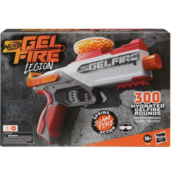 Stürze dich in die Schlacht mit den Nerf Pro Gelfire Blastern, deren hydrierte Kugeln beim Aufprall explodieren! Die Nerf Pro Gelfire Kugeln sind in der Packung noch dehydriert, so dass eine große Menge an Kugeln auf kleinem Raum untergebracht werden kann. Wird Wasser hinzugefügt, um die Patronen zu hydratisieren, so sind sie zum Gebrauch bereit. Die hydrierten Kugeln feuern mit hoher Geschwindigkeit aus dem Blaster und explodieren, wenn sie ein Ziel treffen. Damit ist kein Aufheben der Patronen mehr nötig. Der Nerf Pro Gelfire Legion Blaster verfügt über eine Federzündung, für die keine Batterien benötigt werden. Mit der Slam-Fire-Funktion kann er einen anhaltenden Strom von Kugeln abfeuern. Er enthält einen Trichter mit 130 Schuss Kapazität und eine Abzugssperre gegen versehentliches Abfeuern. Er wird mit einem Beutel mit 5000 Kugeln ausgeliefert. Art.-Nr.: 100010286