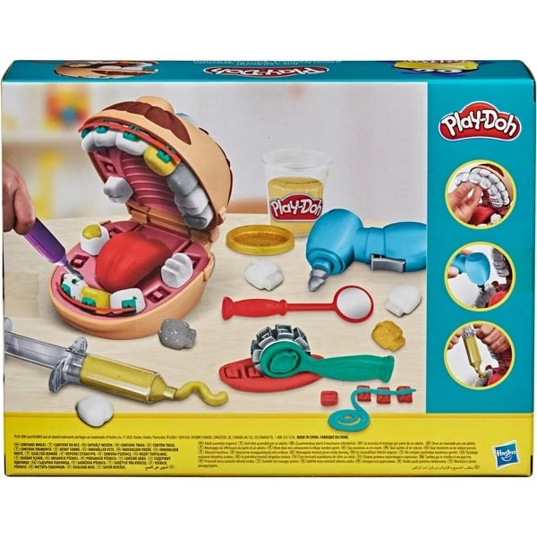 Zahnarzt Dr. Wackelzahn lädt zum Rollenspiel ein und führt die Kleinen spielerisch an das Thema Zahnarztbesuch heran. Hier streckt der Patient auf lustige Art die Zunge heraus und wartet geduldig darauf, behandelt zu werden. Mit der Zahnform entsteht im Nu eine ganze Zahnreihe aus Play-Doh-Knete und dann können die Zähne mit dem handbetriebenen Bohrer und der Knetspritze behandelt oder mit Füllungen versehen werden. Mit Play-Doh „Kariesknete“ mit grünen Sprenkeln und gold- und silberfarbener Play-Doh für eine Zahnspange und Plomben geht es in der Zahnarztpraxis von Dr. Wackelzahn rund. Mit insgesamt 10 Zubehörteilen als Zahnarztinstrumente und 8 Dosen Knete eignet sich dieses Zahnarzt-Set hervorragend, Kindern ab 3 Jahren die Angst vor dem nächsten Zahnarztbesuch zu nehmen.Art.-Nr.: 1716937