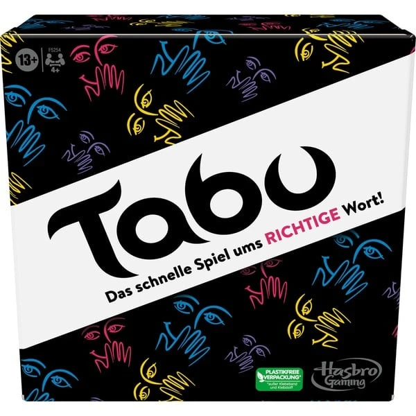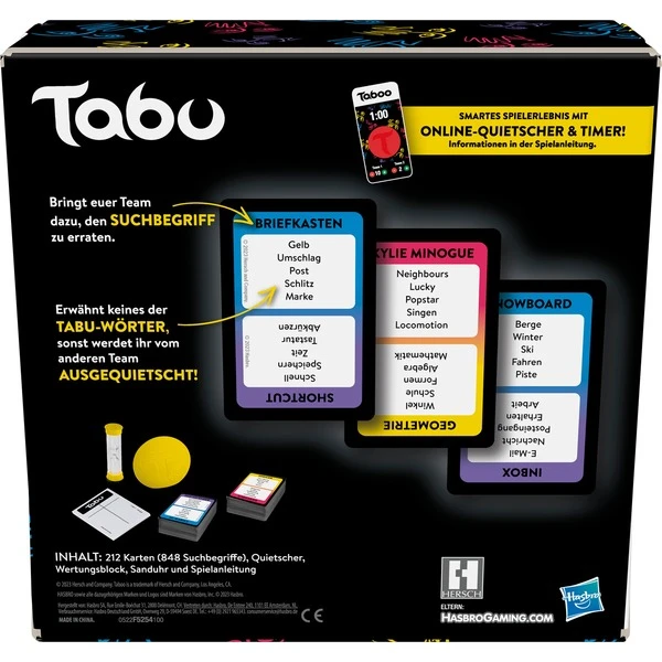 Bei Tabu treten die Spieler in einem rasanten Spiel gegen die Zeit an: Es geht darum, den Mitgliedern des eigenen Teams den gesuchten Begriff auf der Karte zu erklären, ohne selbst die Tabu-Wörter zu verwenden. Diese Version von Tabu warte mit frischen und trendigen Karten auf. Die Spiel haben die Möglichkeit, den webbasierten Timer, Quietscher und Punktezähler zu verwenden oder aber ganz klassisch mit der enthaltenen Sanduhr, dem Tabu-Quietscher und dem Wertungsblock zu spielen.