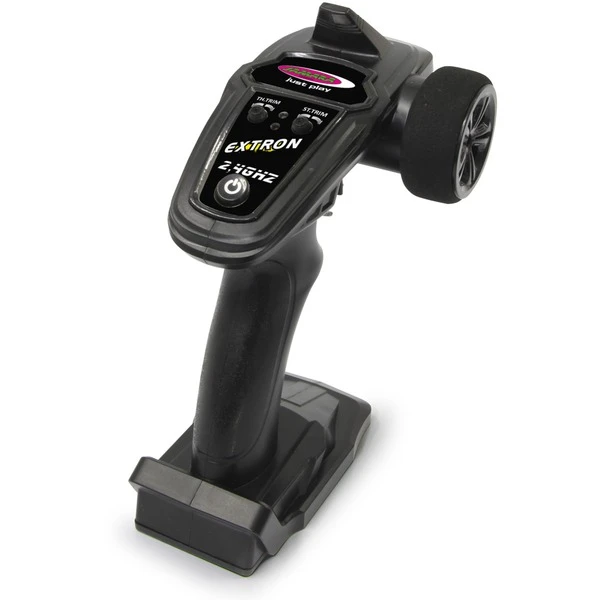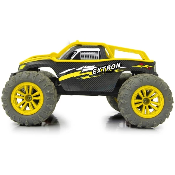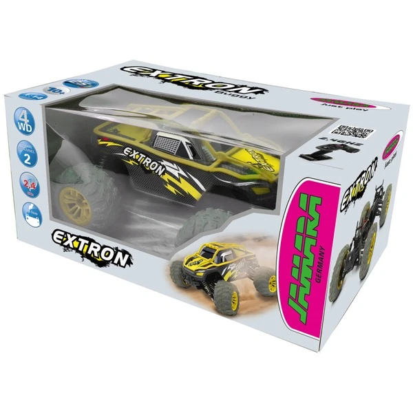 Der Jamara Extron Monstertruck verfügt über einen kräftigen Bürstenmotor und ist spielend leicht zu steuern. Dank Allradantrieb mit kugelgelagerten Antriebswellen vorne und hinten kommt man überall gut voran. Dazu ist das Fahrwerk voll gefedert und die maximale Geschwindigkeit von Anfänger bis Profi am Sender voreinstellbar. Zur weiteren Ausstattung gehören eine Einzelradaufhängung vorne und hinten, weiche Gummireifen mit Stollenprofil, ein Rammschutz vorne und hinten und eine stabile Karosserie mit Überrollkäfig. Art.-Nr.: 1683605