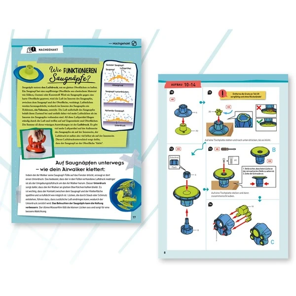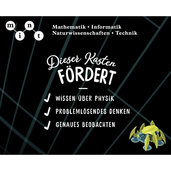 Hoch hinaus! Einfach unglaublich, wie dieser Roboter-Käfer die Fensterscheibe hochklettert! Der Zusammenbau des kleinen, flinken Kletterkünstlers ist für Kinder von 8 bis 12 Jahren einfach umgesetzt: Die etwa 50 Einzelteile zusammenklicken und Batterie einlegen. Mit seinen sechs Beinen und der speziellen Saugnapftechnologie hangelt sich der Air Walker unermüdlich an steilen Scheiben und glatten Spiegeln entlang. Wie das Elektro-Pumpsystem im Inneren des kleinen Roboters funktioniert, erfahren die Kinder in der Anleitung. Zusammenbauen und in Bewegung setzen – mit dem KOSMOS Experimentierkasten macht Robotik Spaß!Art.-Nr.: 1732692