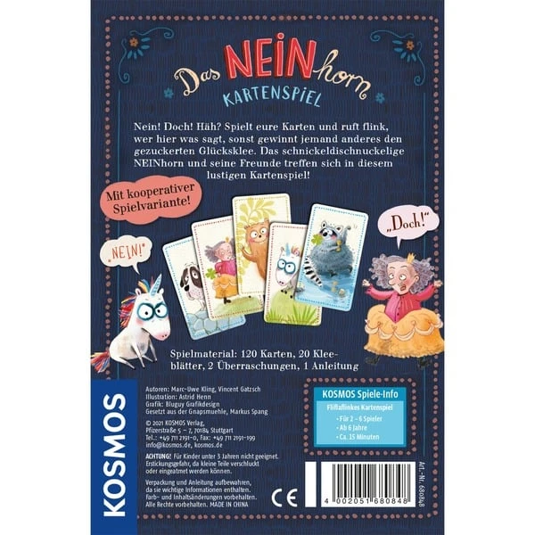 Dieses Einhorn ist einzigartig! Es lebt mit seiner Familie im Herzwald und wird von allen rundum verwöhnt. Trotzdem hat es überhaupt keine Lust, sich gut zu benehmen und haut eines Tages ab! Auf seinem Weg trifft es einen besonderen Waschbären, einen seltsamen Hund und eine außergewöhnliche Prinzessin. Gemeinsam bilden die vier das beste bockige Team, das je gesehen wurde! Ganz schön schnell wird dieses Kartenspiel gespielt. Dabei deckt jeder Spieler abwechselnd eine Karte für alle erkennbar auf und sagt sofort das Wort, das zum aufgedeckten Tier passt. Mit dem NEINhorn von Erfolgsautor Marc-Uwe Kling und seinen Freunden machen Wortspiele noch mehr Spaß.Art.-Nr.: 1733183