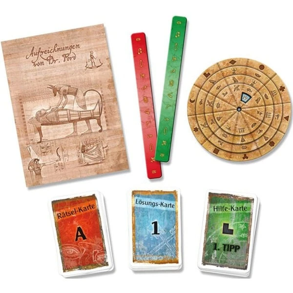 | Inhalt/Ausstattung | 1 Buch, 1 Decodier-Scheibe, 23 Rätsel-Karten, 30 Lösungs-Karten, 33 Hilfe-Karten, 2 seltsame Teile, 1 Spielanleitung | ||