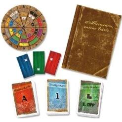 | Inhalt/Ausstattung | 1 Buch, 1 Decodier-Scheibe, 22 Rätsel-Karten, 30 Lösungs-Karten, 33 Hilfe-Karten, 3 seltsame Teile, 1 Spielanleitung | ||