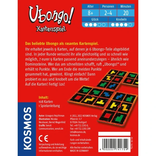 Ubungo wird zum Kartenspiel – auch für unterwegs! Es werden je 9 Karten ausgeteilt, auf denen jeweils 6 Ubongo-Teile abgebildet sind. Dann geht es los und alle versuchen gleichzeitig und so schnell wie möglich, 7 ihrer 9 Karten passend aneinanderzulegen – ähnlich wie Dominosteine. Wer das am schnellsten schafft, ruft „Ubongo“ und erhält 10 Punkte. Die anderen SpielerInnen gehen aber auch nicht leer aus. Die Spannung steigt von Runde zu Runde. Wer am Ende die meisten Punkte gesammelt hat, gewinnt.Art.-Nr.: 1877913