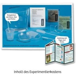 | Inhalt/Ausstattung | Anleitung, Salzkrebschen-Eier, Futter, Meersalz, Aufzuchtstation, Messbecher, Beobachtungsschale, Spatel, Pipette, Lupe | ||