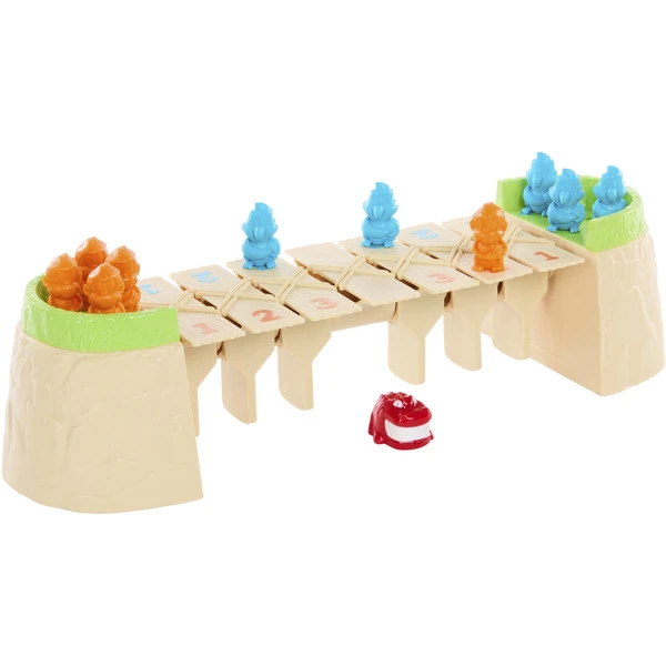 Verrückter Spielspaß mit Krokodilen: Zwei Spieler müssen ihre Spielfiguren über die Brücke auf die andere Seite bringen. Doch Vorsicht: Ein Alligator kann verhindern, dass sie ihr Ziel erreichen, indem er sie von der Brücke fallen lässt. Der Alligator wird unter die Brücke gerollt, um zu erfahren, wie viele Felder er vorrücken darf. Dabei können aber die Spielfiguren des Gegenspielers (oder sogar die eigenen) von der Brücke stürzen. Der erste Spieler, der drei seiner Spielfiguren auf die andere Seite bringt, gewinnt das Spiel. Art.-Nr.: 1919809