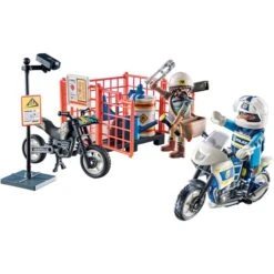 | Inhalt/Ausstattung | Figuren: 1 Polizist, 1 Räuber. Zubehör: 1 Helm, 1 Pistole, 1 Tasche, 1 Bolzenschneider, 1 Taschenlampe, 1 Polizeimotorrad, 1 Geländemotorrad, 1 Lampe, 1 Überwachungskamera, 1x Verkehrsschilder. | ||