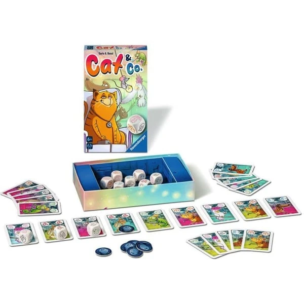 Die Party ist in vollem Gang, doch Kater Carlo, der Miesepeter, knipst schon wieder das Licht aus! Wer kann sich noch erinnern, welche Tiere mitgefeiert haben? Die Tiere auf den Würfeln sind von allen Spielern nur ganz kurz zu sehen, bevor die Schachtel wieder zu ist. Karte für Karte legen nun die Spieler die Tiere nach. Aber waren es zwei oder sogar drei Kakadus? Wer es sich am besten merken konnte, gewinnt! Cat & Co ist ein lustiges Würfel-Merkspiel für Kinder ab 6 Jahren. Art.-Nr.: 1894551
