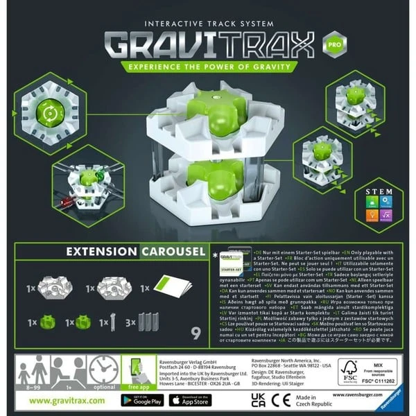 GraviTrax – das innovative Baukastensystem für anspruchsvolle Kugelbahnen. Aus einer Vielzahl an verschiedenen Bausteinen und Schienen lassen sich bei geschickter Nutzung der physikalischen Gesetze aktionsreiche Streckenverläufe planen, ausprobieren und realisieren. Mit den zahlreichen Erweiterungs-Sets wird das freie Bauen und Konstruieren des innovativen Bausystems GraviTrax jedes Mal aufs Neue noch interessanter und spannender! Mehr Möglichkeiten – mehr Spaß! Das Carousel ist ein wahres Multitalent: Über mehrere Ein- und Ausgänge werden zwei Ebenen miteinander verbunden und der Stein kann während eines Durchlaufs mehrmals genutzt werden. Hineinrollende Kugeln können entweder im Carousel Platz nehmen oder dieses starten lassen. Ist das Carousel einmal in Fahrt, werden alle geparkten Kugeln auf die Bahn geschickt. Wie häufig können die Kugeln bei einem Durchgang mit den Carousel fahren?Art.-Nr.: 1828836