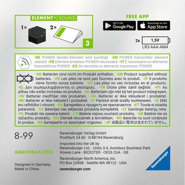 GraviTrax – das innovative Baukastensystem für anspruchsvolle Kugelbahnen. Aus einer Vielzahl an verschiedenen Bausteinen und Schienen lassen sich bei geschickter Nutzung der physikalischen Gesetze aktionsreiche Streckenverläufe planen, ausprobieren und realisieren. Mit den zahlreichen Erweiterungs-Sets wird das freie Bauen und Konstruieren des innovativen Bausystems GraviTrax jedes Mal aufs Neue noch interessanter und spannender! Mehr Möglichkeiten – mehr Spaß! Durch das Power Element Sound werden coole Soundeffekte in einen GraviTrax-Aufbau integriert. Dabei besteht die Möglichkeit, zwischen verschiedenen Sound-Themen zu wechseln. Außerdem kann per Knopfdruck eine Hintergrundmusik ausgewählt werden.Art.-Nr.: 1913195