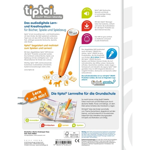 Heimat- und Sachkunde werden in diesem tiptoi-Buch in einen interaktiven Lernspaß verpackt. In einem spannenden Kriminalfall reist Detektiv Oskar quer durchs Land. Die Kinder entdecken mit ihm Deutschland und seine Städte, Gebirge, Gewässer, Bundesländer und Sehenswürdigkeiten. Auf drei verschiedenen Deutschlandkarten und weiteren detaillierten Kartenausschnitten lernen sie topografische und politische Karten zu lesen. Am Ende werden Oskar und die Kinder mit einem Schatz belohnt.Art.-Nr.: 1876181