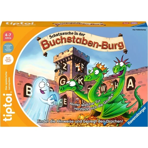 Im tiptoi-Spiel „Schatzsuche in der Buchstabenburg“ suchen die Kinder den Schatz des Drachen. Tiptoi nennt den Kindern Laute oder Tiere, die sie den passenden Bildern oder Buchstaben zuordnen müssen. Wurde der Schatz gefunden, wählt tiptoi eine von zehn Aufgaben des Drachen aus. Bei diesen Aufgaben geht es um Laute, Reime, Silben und Wörter. Zusätzlich gibt es eine Variante für Fortgeschrittene, bei der tiptoi Tiere ansagt, zu denen die Kinder die Buchstaben finden müssen. So lernen sie ganz spielerisch den Umgang mit Buchstaben und Wörtern.Art.-Nr.: 1876109