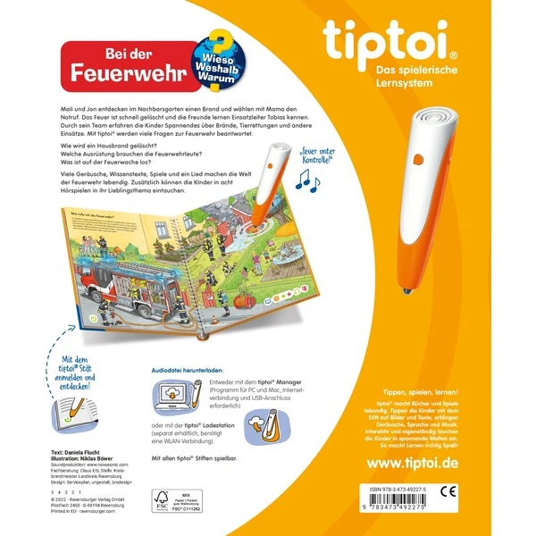 In diesem tiptoi-Buch erfahren Kinder ab 4 Jahren viel Wissenswertes über die Arbeit der Feuerwehr. Dabei begleiten sie Einsatzleiter Tobias, Feuerwehrfrau Sarah und Feuerwehrmann Kenan auf ihren Einsätzen bei Bränden, Hochwasser oder zu Verkehrsunfällen. Zusätzlich zu den tollen Bildern liefert tiptoi (separat erhältlich) dazu spannende Geräusche und Informationen. Art.-Nr.: 1876155