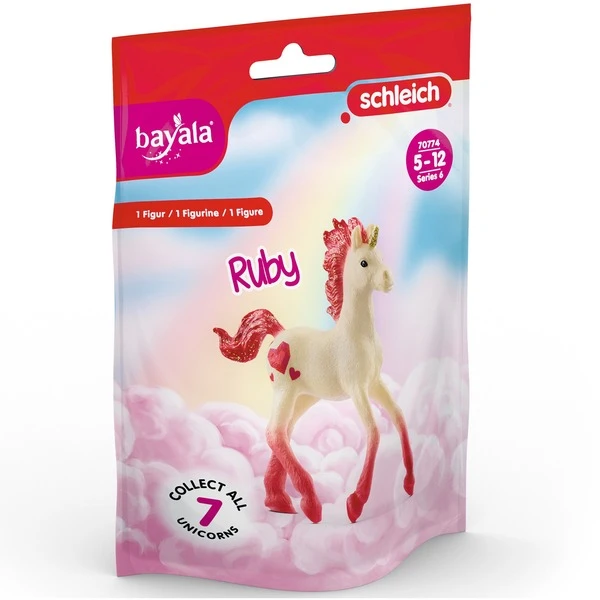 Das Sammeleinhorn Rubin fällt sofort auf, denn sein Schweif und seine Mähne leuchten wie Feuer. Ein toller Kontrast zu seinem cremeweißen Fell. Auf der Flanke hat es ein ebenfalls in Rottönen gehaltenes Herztattoo. Schweif und Mähne glitzern ebenso wie sein Horn golden. Dieses junge Einhorn-Fohlen sprüht vor Unternehmungslust!Art.-Nr.: 1909115