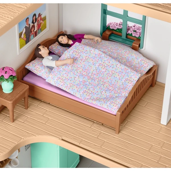 Der Horse Club Lakeside Pferdehof von Schleich® Horse Club beherbergt Hanna und ihre Eltern und bietet vielfältige Spielfunktionen und Accessoires. In der Küche des Wohnhauses wird am Esstisch vom Apfelkuchen aus dem Backofen genascht oder ein Snack aus dem Kühlschrank stibitzt. Teller, Tassen, Topf und Pfanne werden am Spülschrank abgewaschen. Die Mädchenfigur Hannah ist genau wie ihre Eltern Oliver und Caroline Kramer vollbeweglich und kann sitzen, reiten und stehen. Zusammen kümmern sie sich um Quarter-Horse Cayenne und Hannoveraner-Hengst Jupiter. Sie werden mit Striegel und Kardätsche geputzt und bekommen für das Training den Sattel vom Sattelhalter sowie das Zaumzeug angelegt. Während die Eltern abends auf dem Balkon oder dem Sofa am Wohnzimmertisch sitzen, schleicht sich Hannah über die Stockbettleiter auf den Dachboden. Dort spielt sie mit den Katzenbabys und entdeckt einen goldenen Schlüssel. Im Badezimmer machen sich alle bettfertig, bevor die Lampe am Nachtkästchen ausgeknipst wird, sich alle in ihre Decken und Kissen kuscheln und von neuen Pferde-Abenteuern träumen.Art.-Nr.: 1832745