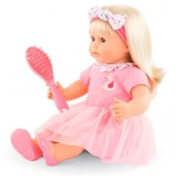Diese etwa 36 Zentimeter große Weichkörperpuppe kann sitzen und ihren Daumen im Mund behalten. Sie kommt in einem süßen Outfit: Ein pinkes Kleid mit Schwanen-Print, eine bunte Schleife und bunter Kragen. Mit dabei hat sie eine Bürste für ihr langes, blondes Haar. Die Schlafaugen lassen die Puppe friedlich ihre Augen schließen, wenn sie hingelegt wird. Mit ihrem geringen Gewicht ist sie auch für kleine Kinder leicht zu tragen und daher gut zum Kuscheln und Umarmen geeignet. Wie alle Corolle-Puppen riecht sie angenehm zart nach Vanille.Art.-Nr.: 1743194