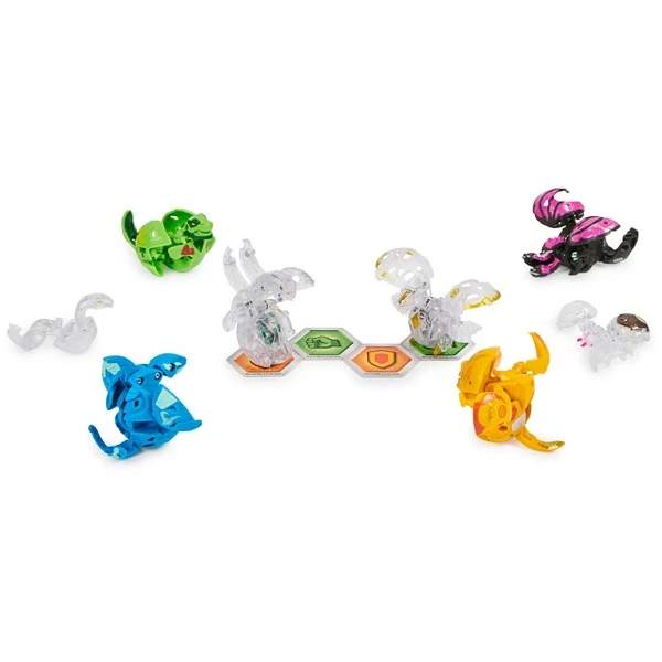 | Inhalt/Ausstattung | 2 Genesis (Leucht-) Bakugan, 4 exklusive Bakugan Balls, 2 exklusive Nanogan, 6 Charakterkarten, 2 Fähigkeitskarten, 4 BakuCores, 2 Portalkarten, 2 Genesis-Bakugan Ausstellungsplattformen, 1 Bakugan Spielanleitung, 1 Bakugan Sammelübersicht | ||