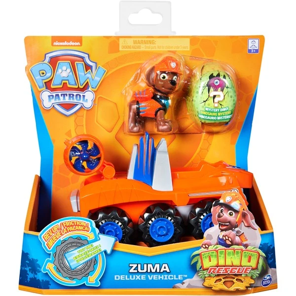 | Inhalt/Ausstattung | Paw Patrol Dino Basis Fahrzeug mit Rückzieh-Mechanismus, authentischen Details, einem funktionsfähigen Werkzeug, Zuma Figur und einer Überraschungs-Dino-Minifigur. | ||
