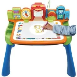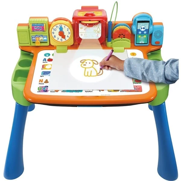 | Inhalt/Ausstattung | Schreibfläche mit LED-Bildschirm und integriertem Tipp-Stift, die interaktive Oberfläche reagiert auf Berührung, herausklappbarer Projektor mit 4 Scheiben (28 Motive), 2 Aktivitätenseiten, die auf die interaktive ABC-Tischoberfläche gelegt werden können (Themen: Zahlen und Zählen, Musik und Instrumente, menschlicher Körper und Kleidung, Formen und Farben), Spieluhr mit verstellbaren Zeigern, Rolle mit einstellbaren Wochentagen, Schieber zum Anzeigen des aktuellen Wetters, Bilderrahmen für eigene Fotos, Musik-Station mit 30 integrierten Melodien, Hocker (maximale Belastung 34 Kilogramm) | ||