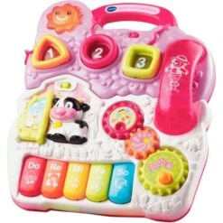 | Inhalt/Ausstattung | 5 bunte Musiktasten, 3 leuchtende Formentasten zum Aufstecken, 3 Zahnräder zum Drehen, 2 bunte Rollen, bewegliche Tür zum Umklappen, Kuhtaste, abnehmbarer Telefonhörer, Bewegungssensor, 1 gesungenes Kinderlied und 11 Kindermelodien (Liedtexte in der Bedienungsanleitung) | ||