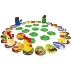 | Inhalt/Ausstattung | 24 eierförmige Wegplättchen, 12 achteckige Hühnerhofplättchen,4 Hühner aus Holz,4 Schwanzfedern aus Holz,1 Spielanleitung | ||